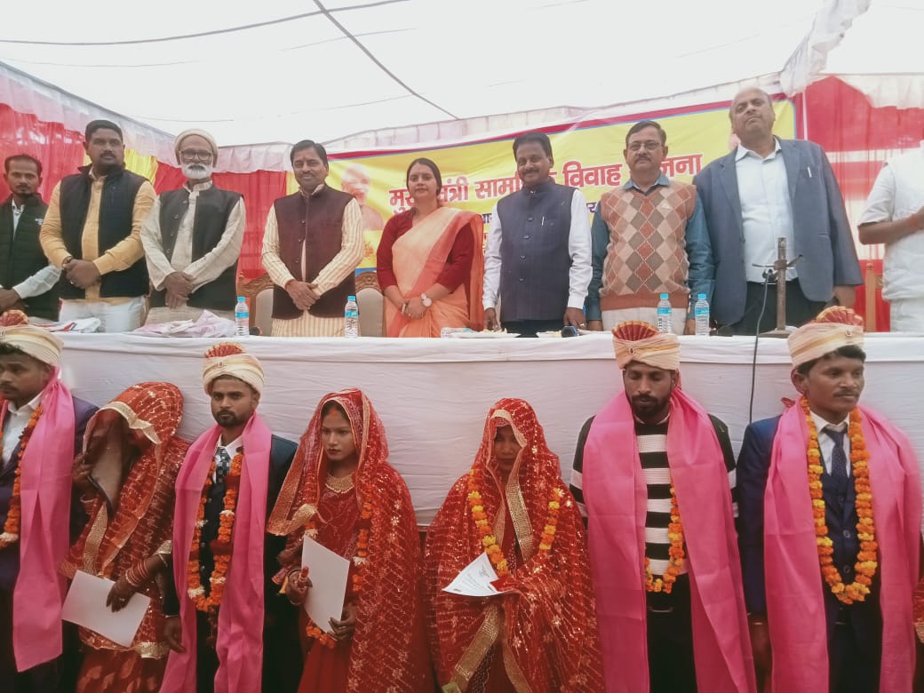 राजातालाब।आराजी लाइन ब्लॉक मुख्यालय पर गुरुवार को खंड विकास अधिकारी सुरेंद्र सिंह यादव की उपस्थिति एवं एडीओ समाज कल्याण प्रमोद पटेल की देखरेख में मुख्यमंत्री सामूहिक विवाह समारोह का आयोजन किया गया। सामूहिक विवाह समारोह आराजी लाइन विकासखंड क्षेत्र के आए हुए 49 जोड़े वर वधूओ ने ब्राह्मण द्वारा मंत्र उच्चारण के साथ एक दूसरे को जयमाल पहनाकर तथा सिंदूरदान कर एक दूसरे के साथ सुख-दुख में साथ देने का वचन देते हुए परिणय सूत्र बंधन में बधे और अग्नि को साक्षी मांग कर सात फेरे लिए तथा मुस्लिम समुदाय के एक जोड़े का मौलवी द्वारा निकाह कराया गया। उक्त सभी नव विवाहित जोड़े को मुख्य अतिथि जिला पंचायत अध्यक्ष पूनम मौर्या तथा विशिष्ट अतिथि ब्लॉक प्रमुख प्रतिनिधि डॉक्टर महेंद्र सिंह पटेल व बीडीओ सुरेंद्र सिंह यादव ने फूलों की पंखुड़ियो से आशीर्वाद देते हुए उपहार के साथ प्रमाण पत्र दिया। खंड विकास अधिकारी सुरेंद्र सिंह यादव ने बताया कि इस मुख्यमंत्री सामूहिक विवाह समारोह में सरकार द्वारा प्रत्येक जोड़े को 15000 रुपया खानपान टेंट व अन्य सामान, तथा कपड़ा, पायल, बिछिया, डिनर सेट, कुकर, कढ़ाई, ट्रॉली बैग, दीवाल घड़ी ,सीलिंग फैन, कुल केज,आयरन प्रेस, चादर ,कंबल, गद्दा, मिष्ठान इत्यादि 25000 रुपये का विभिन्न उपहार के रूप में समान दिया गया। और सरकार द्वारा 10 दिन बाद लड़की के खाते में 60000 रुपया नगद अनुदान राशि भेजी जाएगी। विवाह में आए बार तथा वधू पक्ष के बारातियों को भोजन कराया गया।सामूहिक विवाह समारोह कार्यक्रम में मुख्य रूप से जिला समाज कल्याण अधिकारी गिरीश चंद्र दुबे, जिला पिछड़ा कल्याण अधिकारी रितेश बिंदल, शिव शंकर सिंह, संजय यादव ,मुकेश पटेल, धर्मेंद्र यादव, शिवपूजन सिंह, शारदा उर्फ गुड्डू सिंह, कमलेश पटेल, अजीत वर्मा ,चंद्रभान सिंह, अरविंद पटेल, राजेश कुमार सिंह फूल्ली, चंद्रमा, राजू वर्मा इत्यादि लोग उपस्थित रहे।