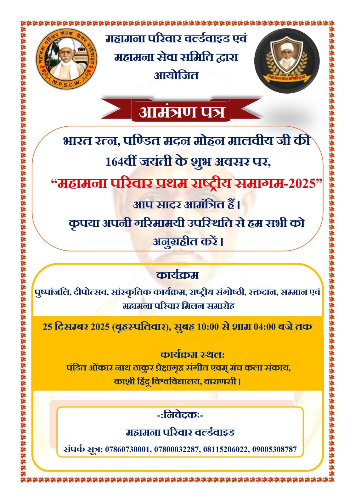 वाराणसी: भारत रत्न पंडित मदन मोहन मालवीय जी की 164वीं जयंती के अवसर पर आगामी 25 दिसम्बर 2025 को काशी हिंदू विश्वविद्यालय में “महामना परिवार प्रथम राष्ट्रीय समागम-2025” का भव्य आयोजन होने जा रहा है। महामना परिवार वर्ल्डवाइड एवं महामना सेवा समिति के संयुक्त तत्वावधान में आयोजित इस कार्यक्रम में देश के कोने-कोने से महामना के मानस पुत्र एवं पुत्रियाँ सम्मिलित होंगे।