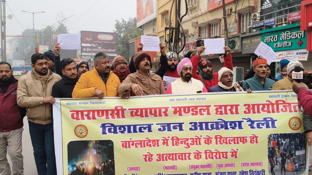 वाराणसी व्यापार मण्डल के तत्वाधान में आज रविवार को सुबह 8 बजे बजे अध्यक्ष अजीत सिंह बग्गा के नेतृत्व में एक विशाल जन आक्रोश रैली बांग्लादेश में हो रहे हिन्दुओं पर अत्याचार के विरोध में निकाला गया जो साजन तिराहे से निकल कर सिगरा तिराहा पेट्रोल पंप तक जा कर समाप्त हुआ साथ साथ बांग्लादेश के विरोध में नारे तखती पर लिख कर लिए हुऐ थे जिसपर बांग्लादेश में हिन्दुओं पर हो रहे अत्याचार को रोको, बांग्लादेश को पाकिस्तान ना बनने दें,मजहब के आड़ में हिन्दुओं पर अत्याचार बर्दाश्त नही, बांग्लादेश में हिन्दुओं को आवश्यक सुरक्षा प्रदान करें इस अवसर पर अध्यक्ष अजित सिंह बग्गा ने कहा इस पूरे घटनाक्रम को दीपू चंद दास के संग पुलिस एवं अर्द्धसैनिक बलों द्वारा किए गए दुर्व्यवहार और उसे जेहादियों को सौंपने से समझा जा सकता है। किस हद तक हिंदू पर अत्याचार हो रहा है पुलिस नें मामला तक दर्ज नहीं किया । ।यहां तक की न्यायालय पर अनुचित दबाब तक बनाया जा रहा है। इसके उलट हिंदू युवतियों से दुर्व्यवहार और बलात्कार करने तथा हिंदू परिवार एवं मंदिरों पर हमला करने वालो पर कोई रोक-टोक नहीं है। ऐसा भी नहीं है कि प्रशासन इस संगठित एवं सुनियोजित अपराध से अवगत् नहीं है। इन्हीं प्रवृतियों के नाते यहां इन दिनों अवयस्क हिंदू लड़कों पर ईशनिंदा के अनुचित आरोप जड़े जा रहे हैं, जिसकी परिणति हर बार जिहादी भीड़ द्वारा पुलिस बल के सामने इनकी नृशंस हत्या के रूप में घटनाएं सामने आ रही है।प्रदेश नेता रमेश निरंकारी नें कहा हिन्दू बांग्लादेश में भाईचारा के साथ रहते थे अब भाई हट गया है हिन्दू केवल चारा बन गये हैं युवा नेता संजय गुप्ता ने कहा की हिंदुओं के साथ बर्बरता हो रही है बांग्लादेश के हिंदू टारगेट पर हैं लोकतंत्र की हत्या हो रही है हिंदुओं की सुरक्षा के लिए सख्त कदम बांग्लादेश को उठाना पड़ेगा और सुरक्षा की गारंटी देनी होगी मीडिया अध्यक्ष दीप्तिमान जी ने कहा 40000 हिंदुओं की हत्या तथा 2 लाख से अधिक हिन्दू महिलाओं के साथ बलात्कार फिर अब दीपू चंद दास को जिंदा जलाया जाना यह अब बर्दाश्त नहीं किया जाएगा इस घटना की जितनी भर्तसना की जाए उतना कम है हमारे प्रधान मंत्री मोदी जी का रुख ये नहीं चलेगा की एक तरफ हिन्दुओं के अत्याचार का विरोध तथा दूसरे तरफ बिजली सप्लाई, खाद्य सामग्री सप्लाई, और गैस सप्लाई हो रहा है इनको मेन लाइन बंद करनी पड़ेगी पाकिस्तान को भीखमाँगाने में तीन साल लग गया बांग्लादेश तीन महीने में ही भीखमाँगा हो जायेगा इस अवसर पर काफी सांख्य में व्यापारी गण उपस्थित थे जिसमे प्रमुख रूप से रमेश निरंकारी, सुशील लखमानी कविन्द्र जायसवाल,संजय गुप्ता,मनीष गुप्ता,दीप्तिमान देव गुप्ता , शरद गुप्ता, मन्नू यादव, जगदीश कुमार,अनूप गुप्