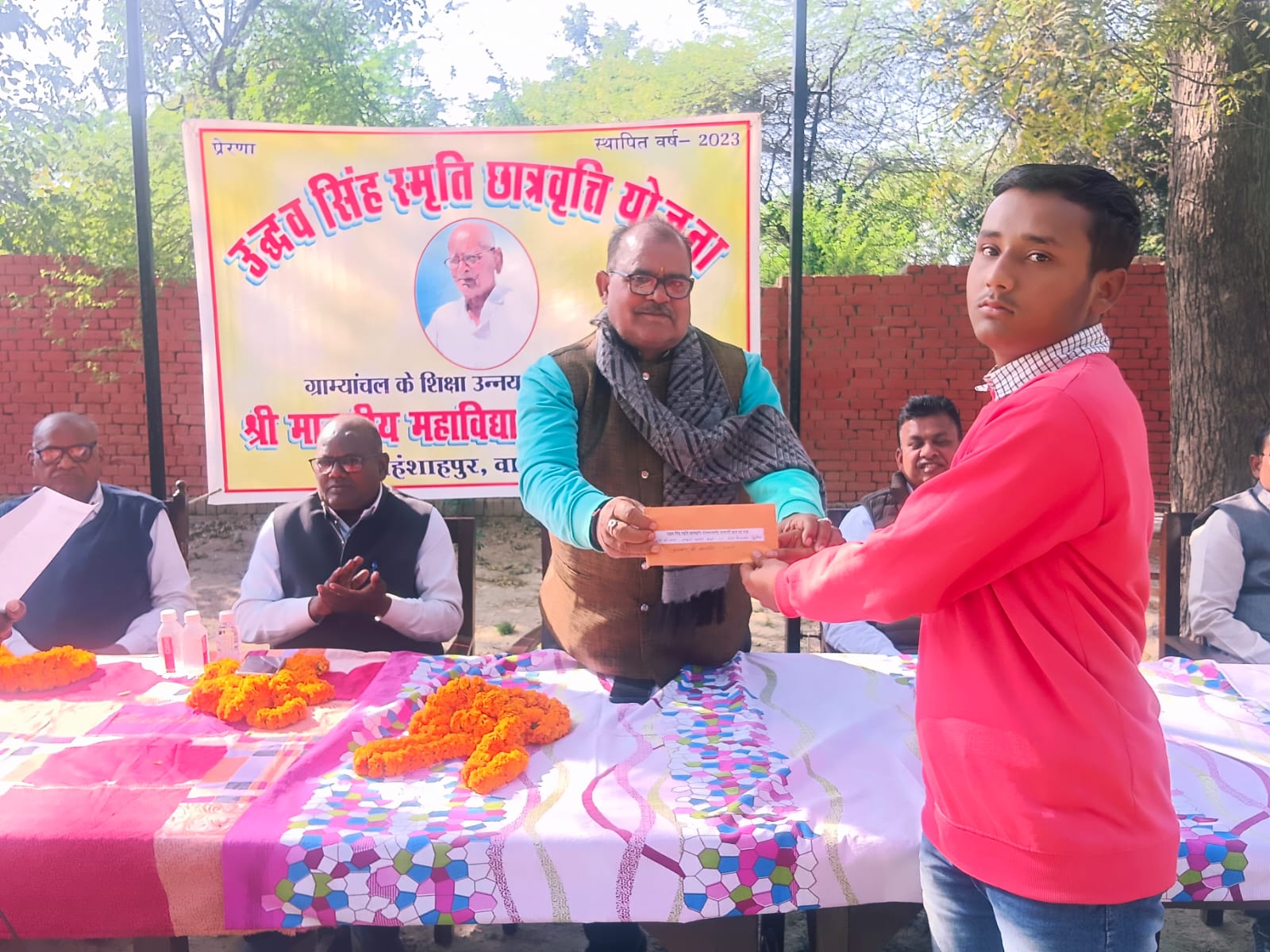 राजातालाब।महामना मालवीय इंटर कॉलेज शाहंशाहपुर में उद्धव सिंह स्मृति छात्रवृत्ति योजना के तहत छात्रों को सम्मानित कर छात्रवृत्ति प्रदान की गई। इस अवसर पर पूर्व जिला विद्यालय निरीक्षक सोमारू प्रधान ने छात्रों को छात्रवृत्ति प्रदान करते हुए कहा कि बच्चों को यह राशि पढ़ने के लिए प्रेरित करती है। माध्यमिक सेवा चयन बोर्ड के सदस्य डॉ हरेंद्र राय ने कहा कि ग्रामीण क्षेत्रों में इस तरह की छात्रवृत्ति से छात्रों का सहयोग होगा। उन्होंने कहा कि अरविंद पटेल ने अपने पिता के मरणोपरांत उनकी स्मृति में यह योजना शुरू कर अच्छा कार्य किया है। छात्रवृत्ति के द्वारा उत्साहित होकर ग्रामीण बालिकाएं भी पढ़ाई जारी रखने और आगे बढ़ाने के लिए प्रेरित होंगी। वरिष्ठ शिक्षक एवं शिक्षक नेता अरविंद सिंह पटेल ने कहा कि उद्धव सिंह स्मृति छात्रवृत्ति योजना के तहत 5 लख रुपए की राशि कोष स्थापित की गई है। जिसके द्वारा हर वर्ष छात्र-छात्राओं को यह पुरस्कार राशि दी जाती है। इस अवसर पर प्रदेश के बेस्ट शिक्षक पुरस्कार प्राप्त चंद्रमणि सिंह ,वीरेश्वर नारायण सिंह, विद्यालय के प्रधानाचार्य मुसर्रत इस्लाम, रीता मिश्रा,अजय सिंह, आदि लोग उपस्थित रहे।